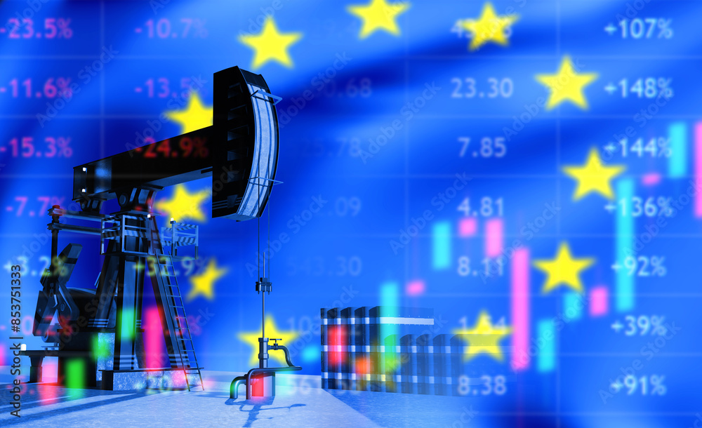 Oil production in EU countries. European union flag. Oil pumps extract petroleum. EU fuel industry. Oil production in European alliance. Quotes of price increases for petroleum in EU. 3d image