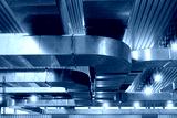 Ventilation pipes under ceiling. Air-conditioning ducts. Ventilation pipes in factory. Air-conditioning ducts under roof. Square pipe for air filtration. Conditioning ducts for manufactory. 3d image