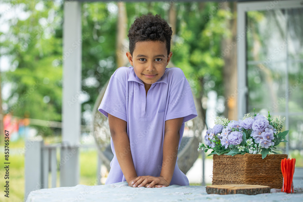 Close up portrait of an eight year old mixed race boy, summer outdoor
