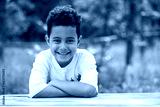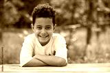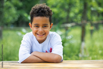 Close up portrait of an eight year old mixed race boy, summer outdoor