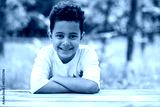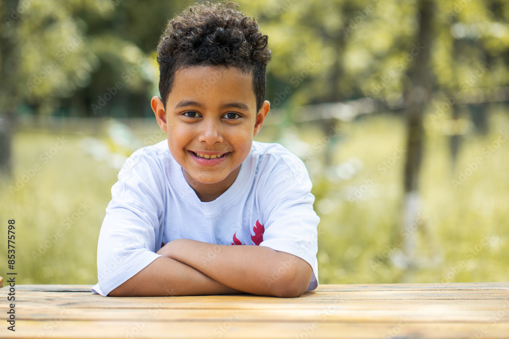 Close up portrait of an eight year old mixed race boy, summer outdoor