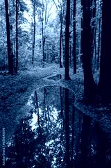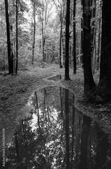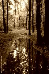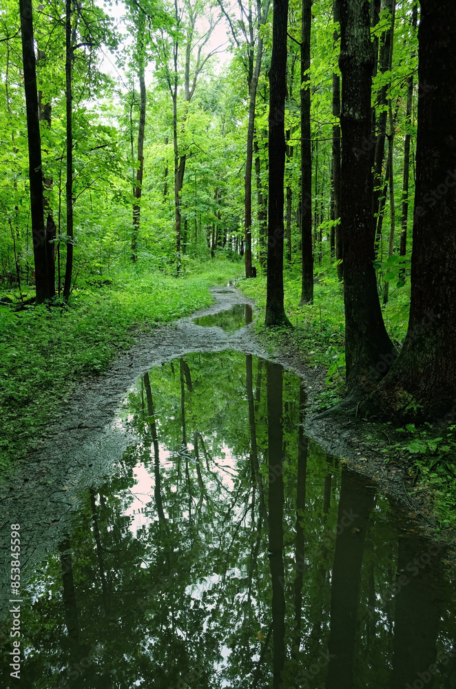 forest after rain. puddle on dirt patch in green forest. Beautiful landscape with road and puddles through green trees.