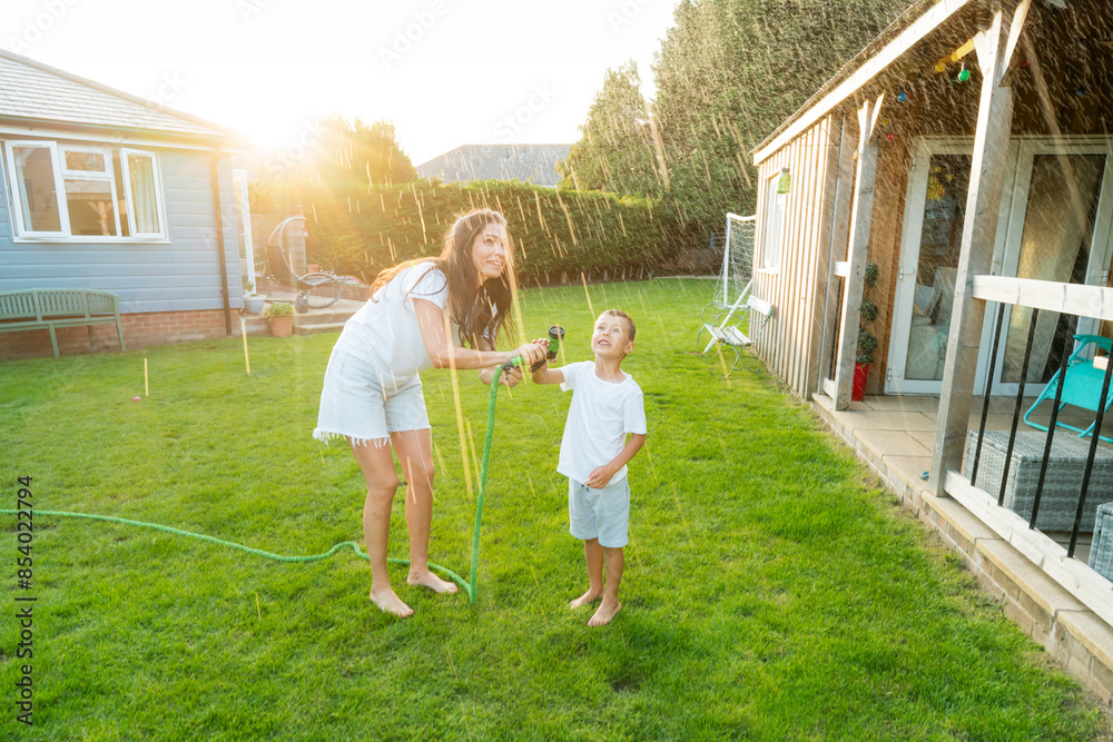 Joyful kid with mother playing with water sprinkler hose, splashing, laughing, having fun together in garden on sunset. Summer outdoor activity. Happy active childhood, family time. Selective focus.