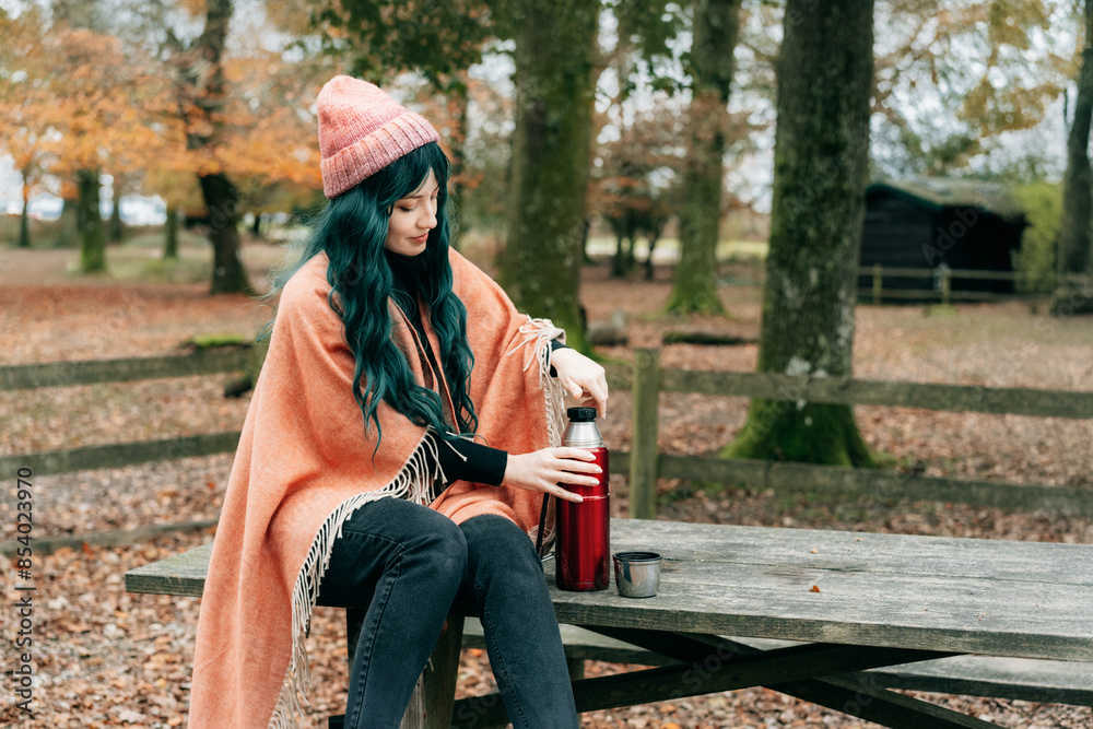 Woman wrapped in Shawl Poncho sits on picnic table pouring hot drink from thermos during autumn walk in forest with fall leaves. Feeling harmony, relax, personal fulfillment. Local travel lifestyle.