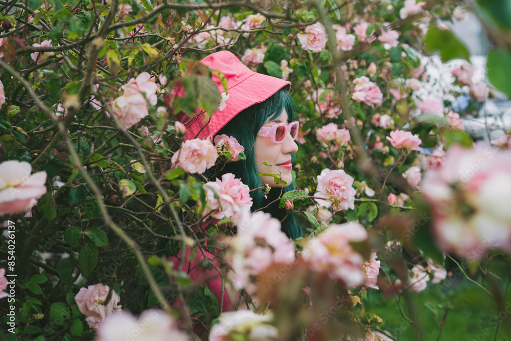 Summer portrait of young hipster woman with green hair in pink magenta bucket hat and sunglasses on blooming roses bush background. Urban street fashion. Gen Z. Summer vacation, fun, positive mood