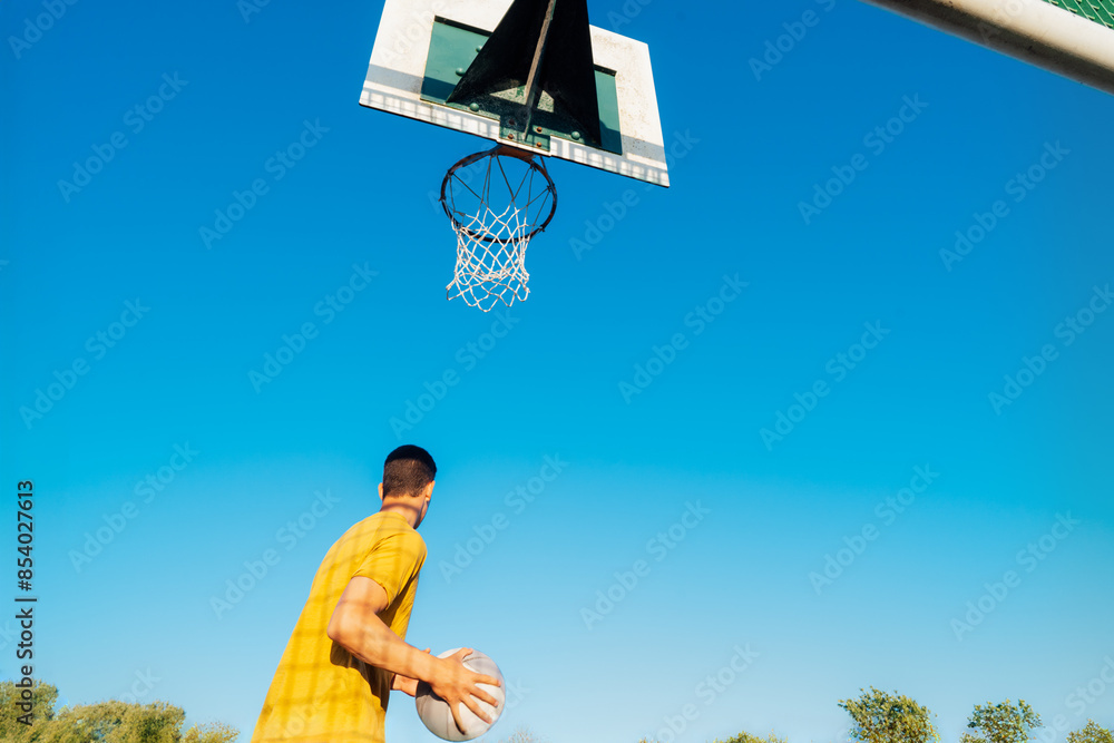 Young Man with basketball ball under hoop, Playing Basketball at Park outdoor playground in sunset light with blue sky background. Basketball match. Teenagers' hobby. Sports and healthy lifestyle