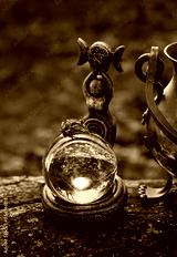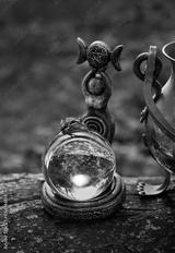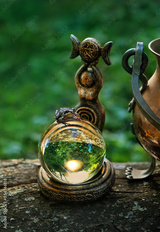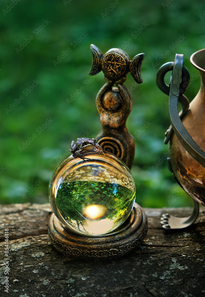 frog on Magic crystal ball, goddess figurine and witch cauldron in forest close up, abstract natural background. Witchcraft, esoteric spiritual ritual for relax, meditation. fairytale, mystery