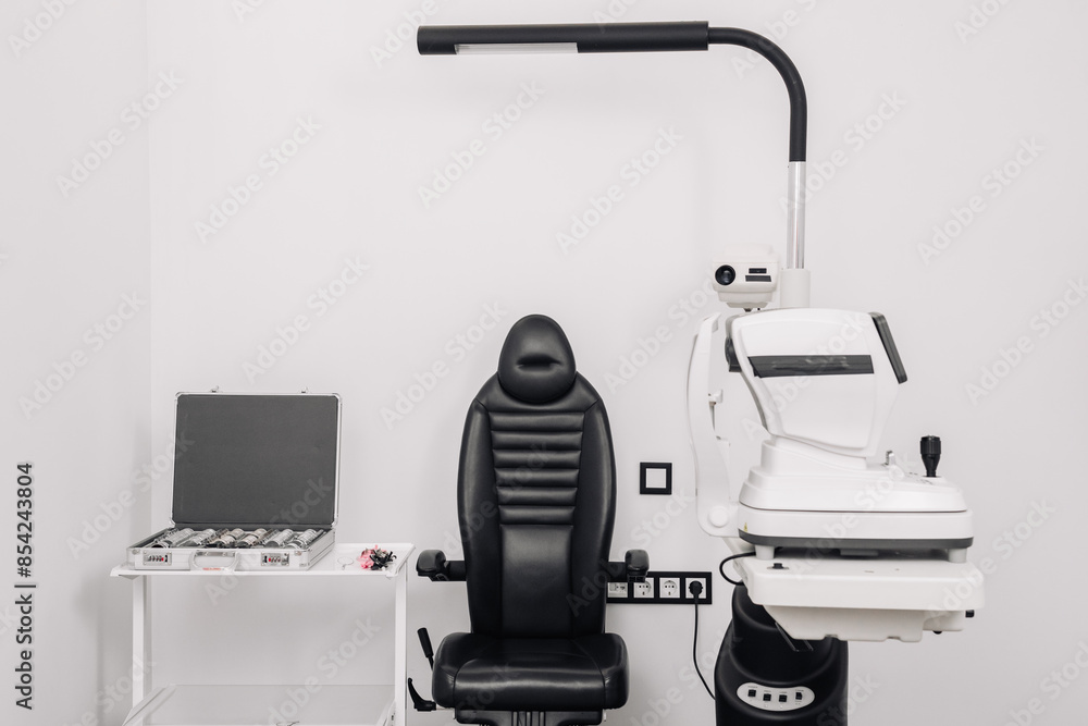 The concept of new ophthalmological and modern technologies, diagnostics and vision treatment. Interior of a modern ophthalmology clinic with modern equipment.