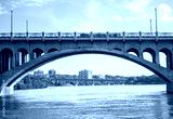 horizontal image of an arched concrete bridge framing skyscrapers and trees in the background with a river flowing underneath and a blue sky in the summer time