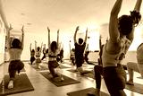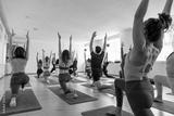 Yoga practitioners perform a kneeling posture with arms raised in a bright, spacious studio.