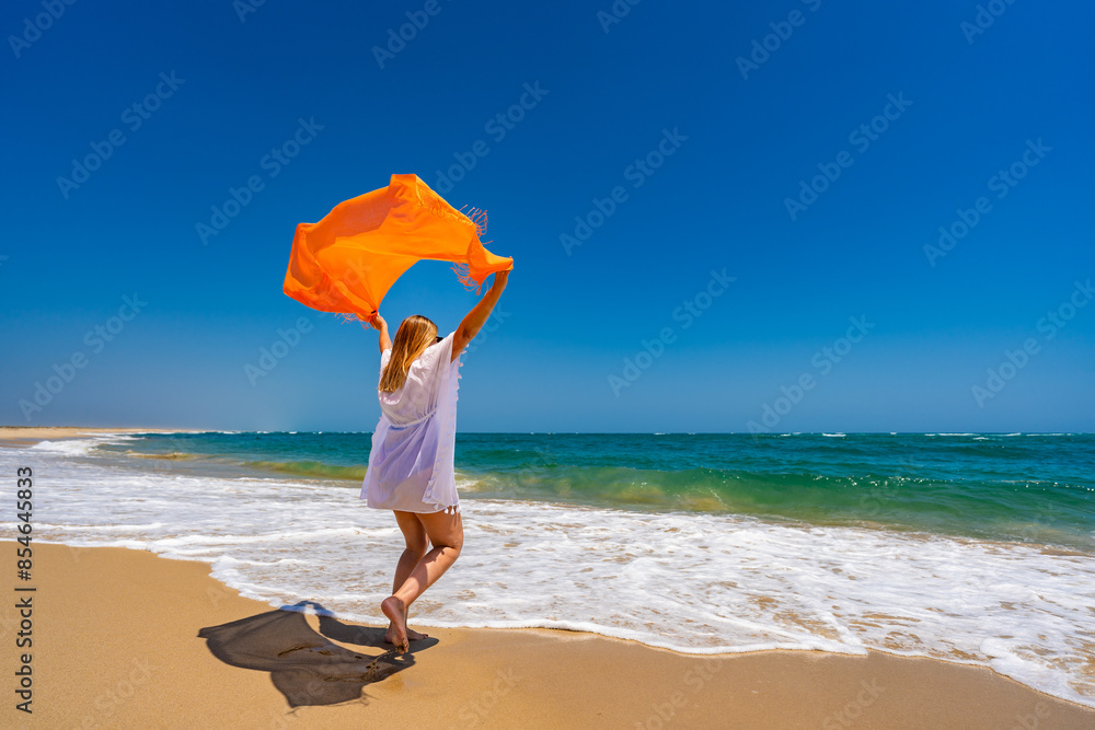 Beautiful woman holding shawl walking on sunny beach Portugal, Algarve, praia Armona