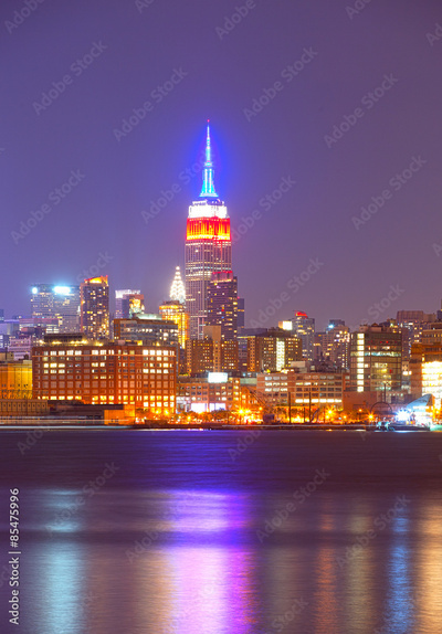 New York City skyline of financial business buildings in Manhattan illuminated at night