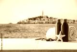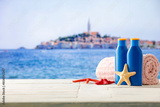 Bottles of tanning oils on a wooden table with a beautiful view of the blue sea and blue sky