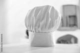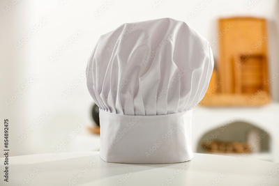 White chef hat on round kitchen table with blurred home interior background.