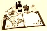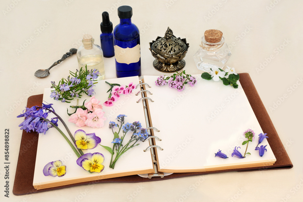 Herbal medicine preparation with spring flowers, herbs and essential oil bottles with notebook. Natural floral nature concept for flower essences and remedies on hemp paper.
