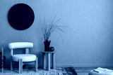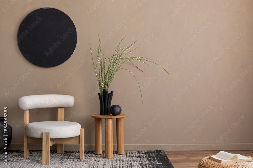 Interior design of beige style living room with modern armchair, hanging decoration on the wall, plant, stool and elegant personal accessories. Home decor. Template. Copy space. .