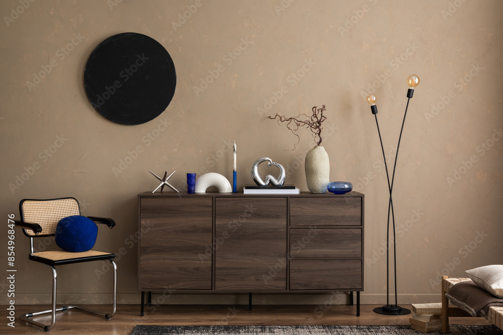 Simple and elegant styling of living room space with brown commode, chair, dried flower in vase decorations, carpet and personal accessories. Home decor. Template.