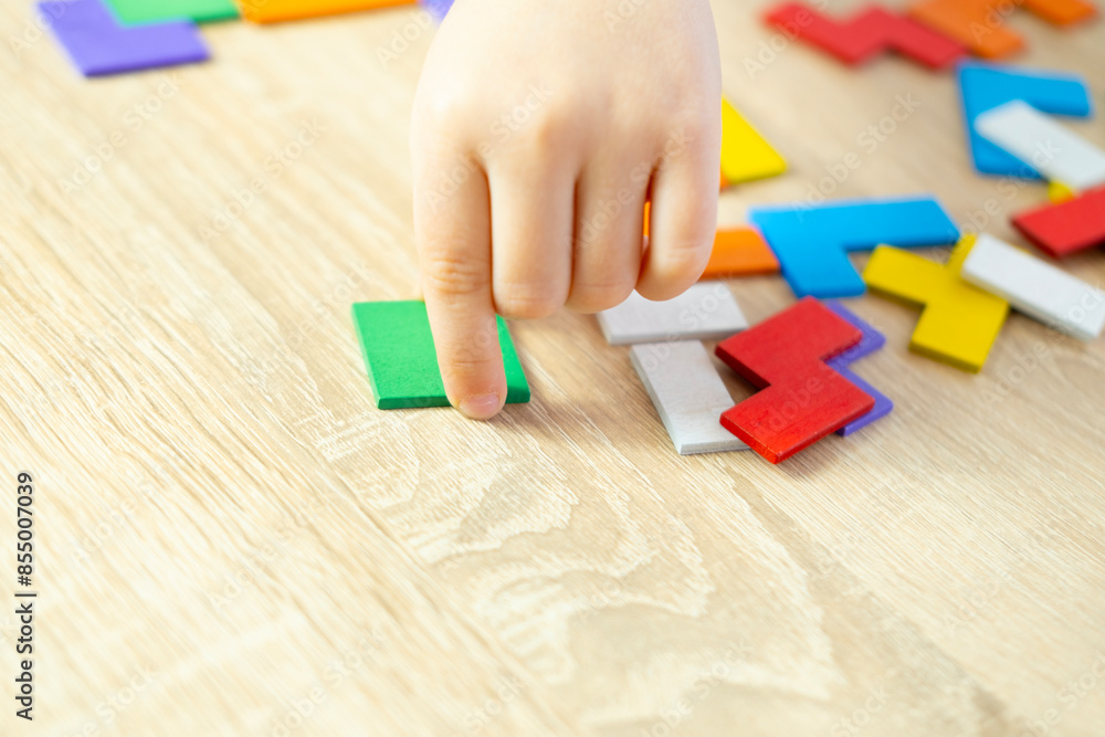 little 5 year old girl playing at home with wooden blocks, child's hand intricate world colorful wooden puzzle, imagination and development fine motor skills