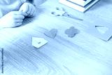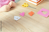 preschooler girl practicing scissor skills by cutting out shapes such house, heart and flowers for applique from colored paper