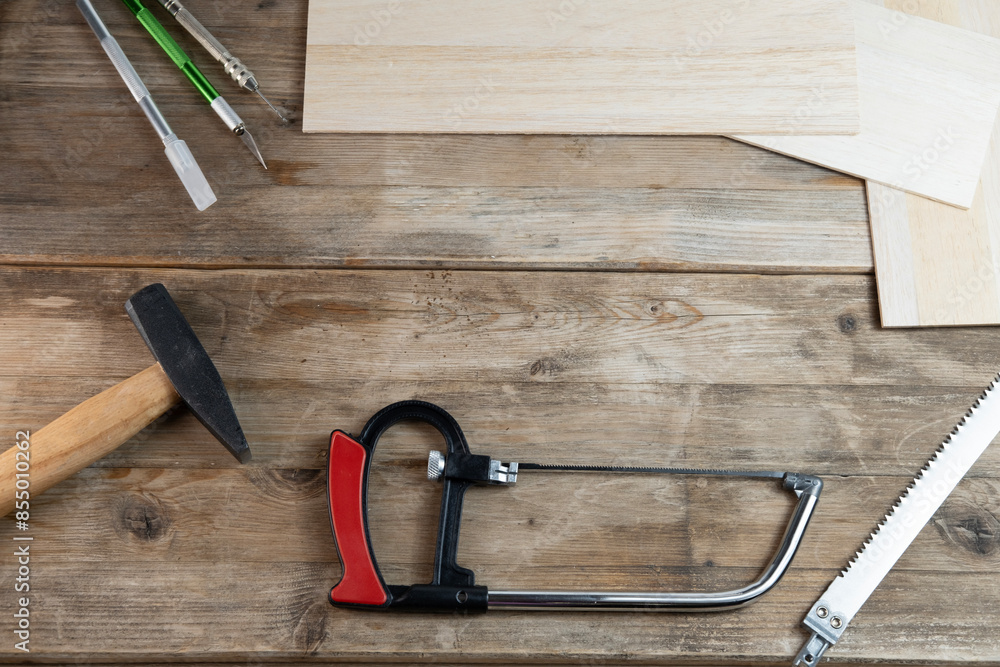 balsa wood, crafting hand tools jigsaw, knife and drill arranged on workbench, crafting essentials