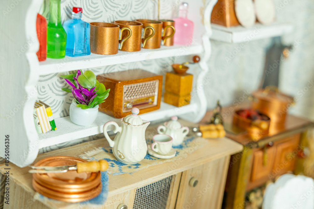 retro-style miniature dollhouse scale kitchen roombox with handcrafted furniture, dishes and utensils, miniature enthusiasts