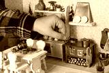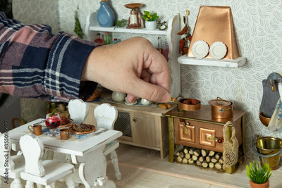 retro-style miniature dollhouse scale kitchen roombox with handcrafted furniture, dishes and utensils, miniature enthusiasts