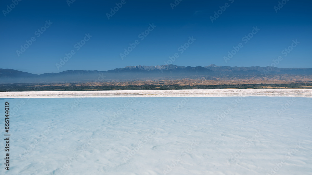 Natural swimming pool with mountain views. A place for relaxation and recovery. Summer holidays and travelling. Transparent water in the pool. Clear sky and mountain view.