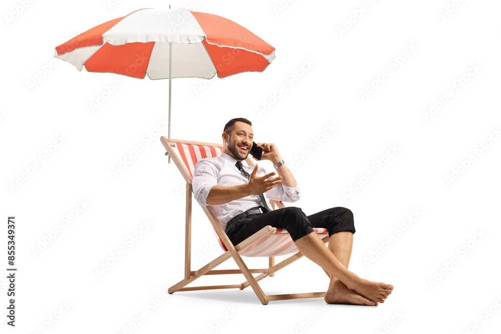 Businessman sitting on a beach chair under umbrella and making a phone call