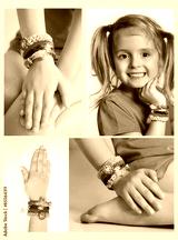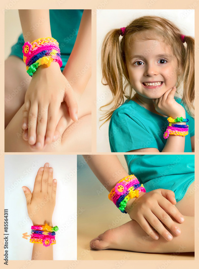 Loom bracelets collage.Rubber wrist accessories on child's hand.