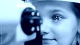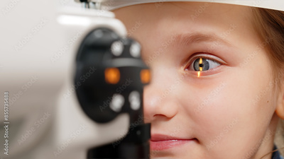 A little patient undergoes an eye test by a professional optometrist using modern diagnostic equipment in an ophthalmology clinic.