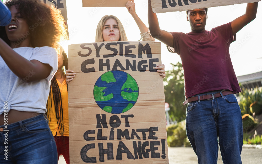 Young group of demonstrators on road from different culture and race protest for climate change - Focus on caucasian girl face