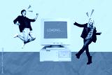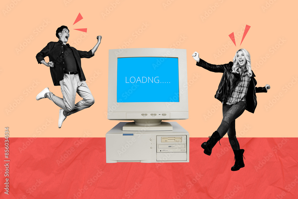 Trend artwork composite sketch image collage of retro computer monitor team young lady man tv propaganda loading jump happy moving
