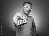 Man with remote control isolated on dark gray background. Guy holding controler, front view. TV - movies watching