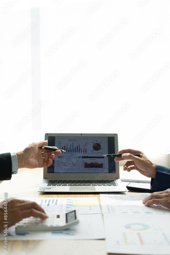 Business groups use tablets to analyze company budget report graphs and brainstorm plans for the future. Vertical close-up image