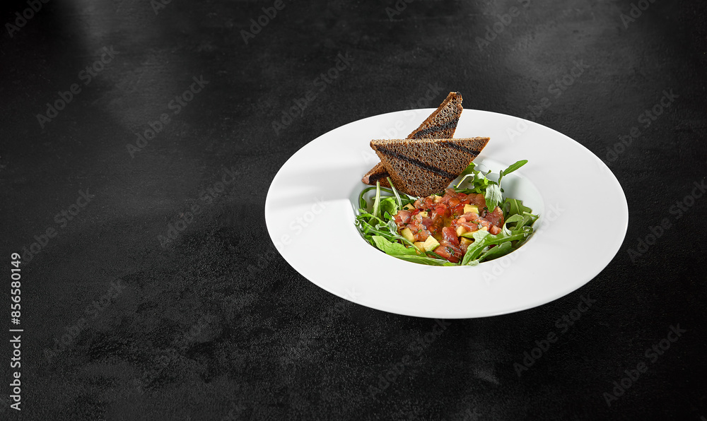 Tuna Tartare with Arugula and Toasts on Black Background – Gourmet Fine Dining
