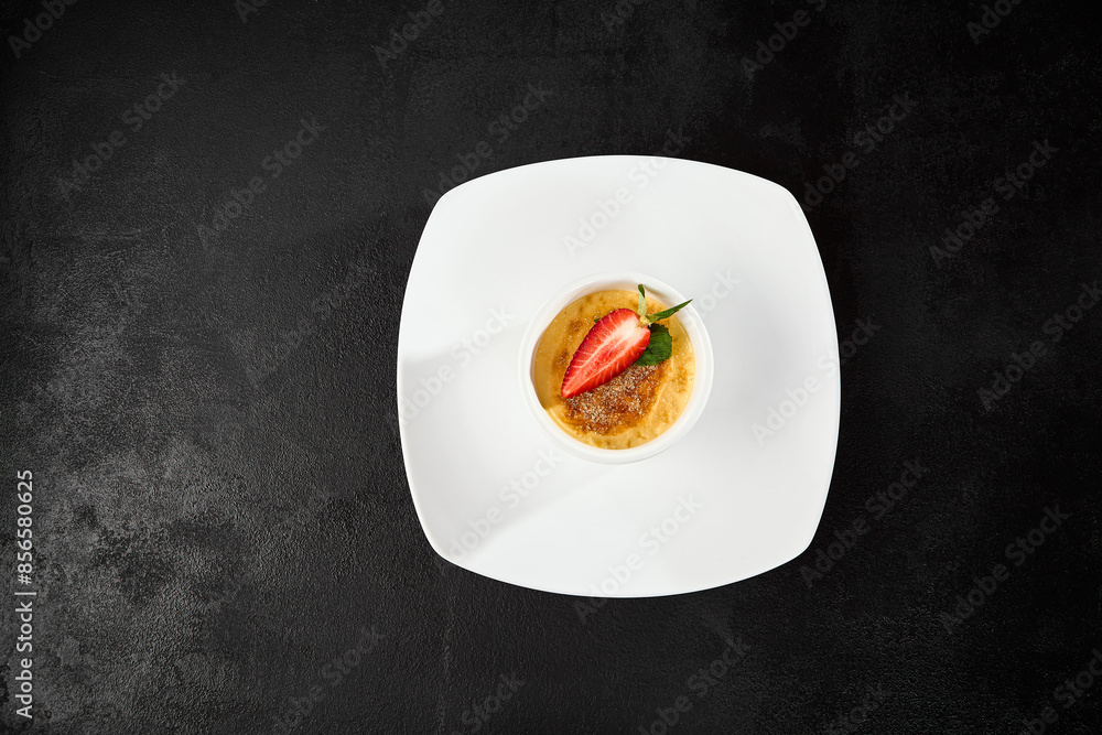 Strawberry Creme Brulee on Elegant Plate Against Dark Background