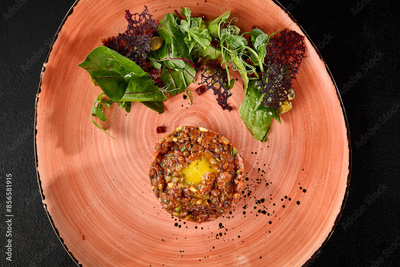 Gourmet Beef Tartare with Quail Egg and Salad Mix – Elegant Plated Appetizer