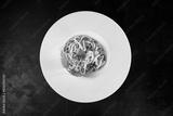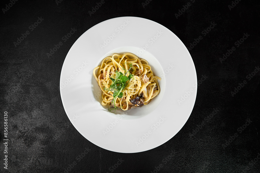 Delicious Pasta with Mushrooms and Cheese - Elegant White Plate on Dark Background