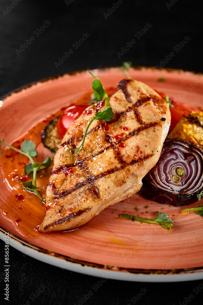 Grilled Chicken Breast with Vegetables and Sweet Chili Sauce on a Plate