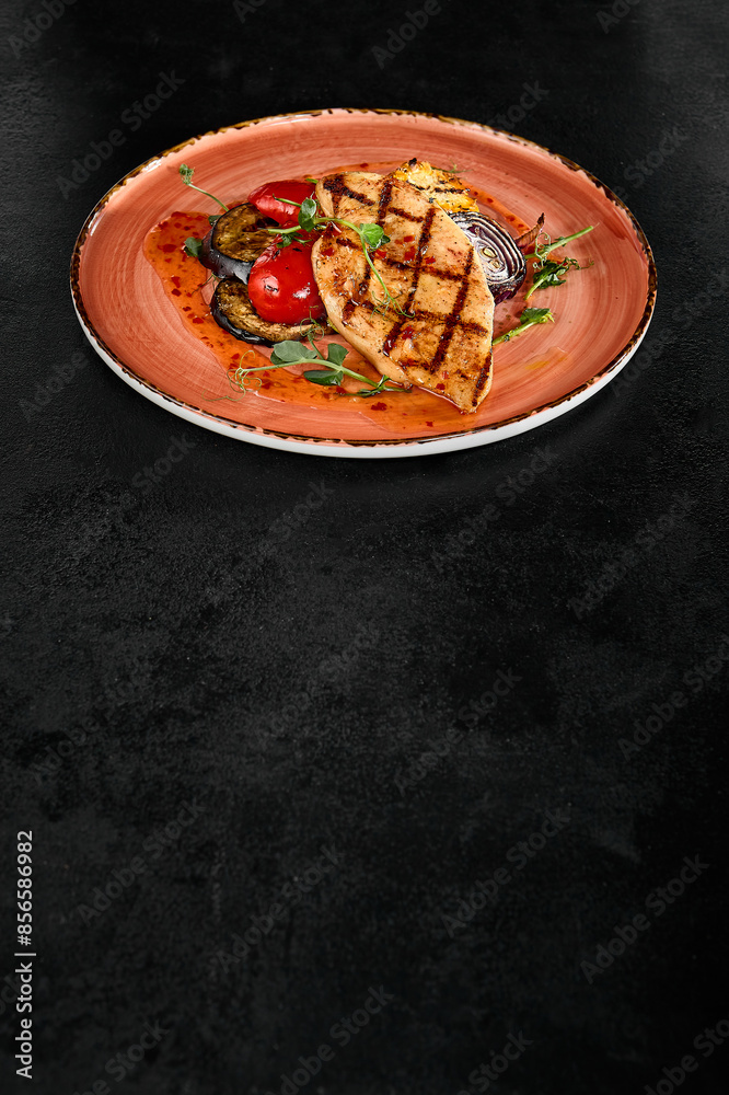 Grilled Chicken Fillet with Vegetables in Sweet Chili Sauce – Healthy Gourmet Meal Against Black Background