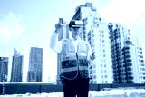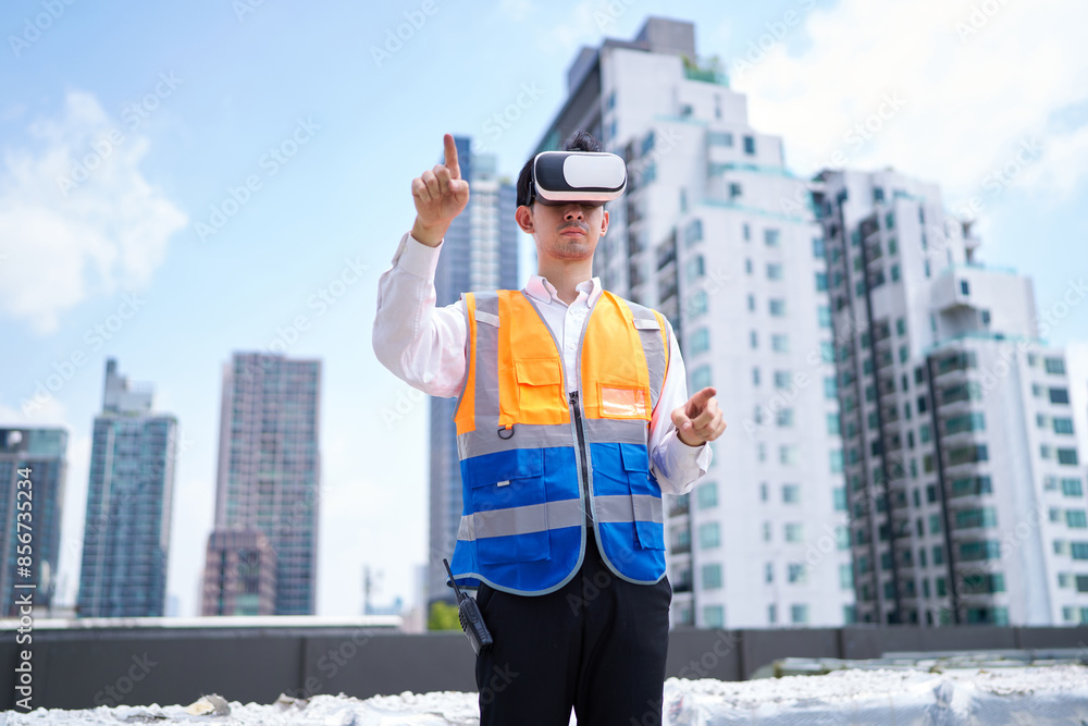 Engineer or worker wearing virtual reality glasses(VR) at urban industrial site