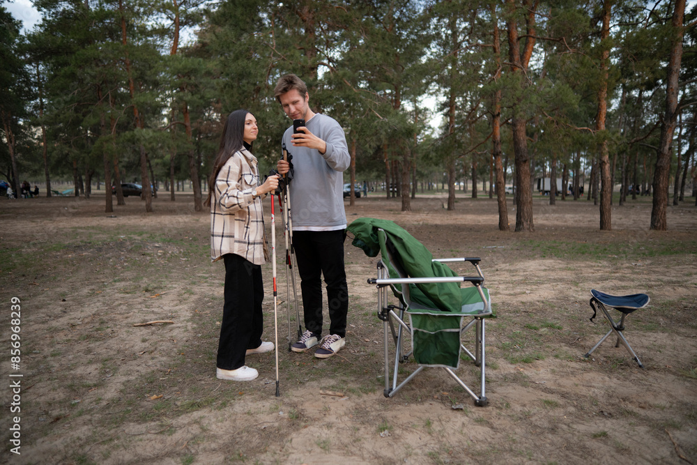 A couple poses for a selfie while hiking in a forest. The man holds a phone and the woman stands beside him, both holding hiking poles