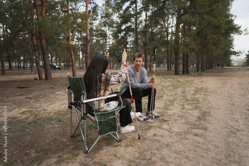 couple enjoys a peaceful afternoon sitting on folding chairs in a forest clearing. They are surrounded by tall trees and are likely enjoying the fresh air and sunshine