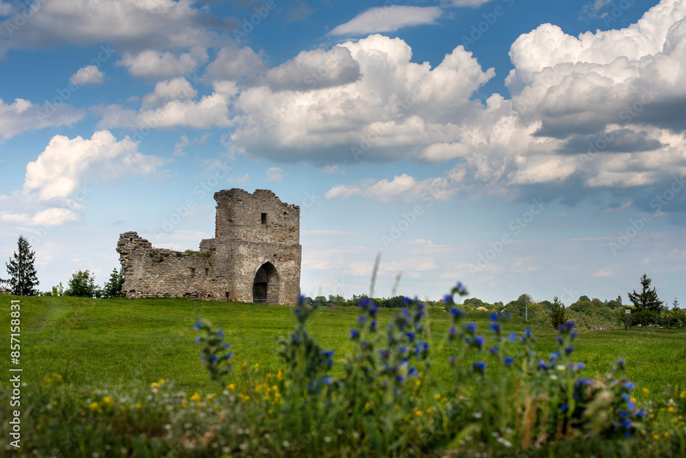 Ancient ruins entrance gate of castle on Bona mountain Kremenets, Ternopil region, Ukraine, beautiful clouds on sky and flowers