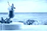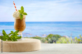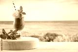 Iced coffee in a clear glass with cream on a wooden board on a table top with a beautiful sea and the glow of the sun in the background