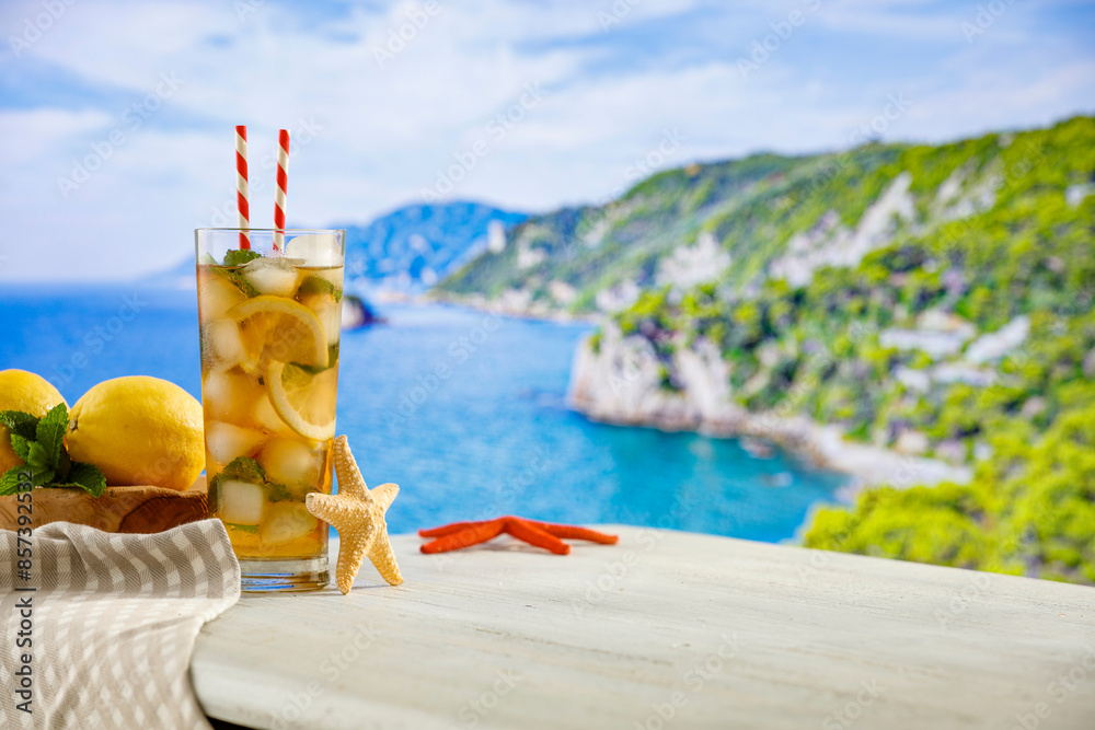 Glass of cold cocktail with lemon and mint on the wooden table with beach and sea and sky background.