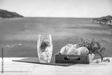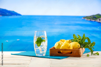 Lemon fruits, fresh mineral water, ice in glass on wooden table top with beautiful blur landscape of calm blue sea and blue sky. Vacation time and cool drink for hot day.