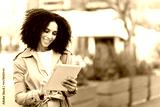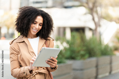 Black Woman Entrepreneur Using Digital Tablet Outdoors in Urban Setting