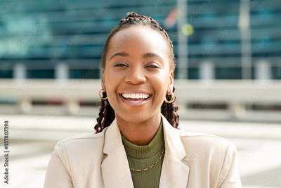 Confident Black Woman Entrepreneur Smiling Outdoors in Business Setting