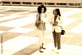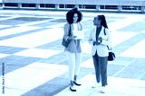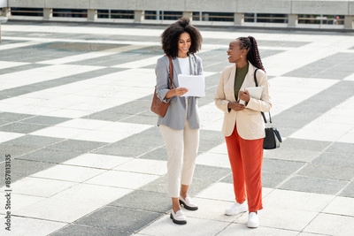 Smiling Black Businesswomen Discussing Documents Outdoors in Professional Attire